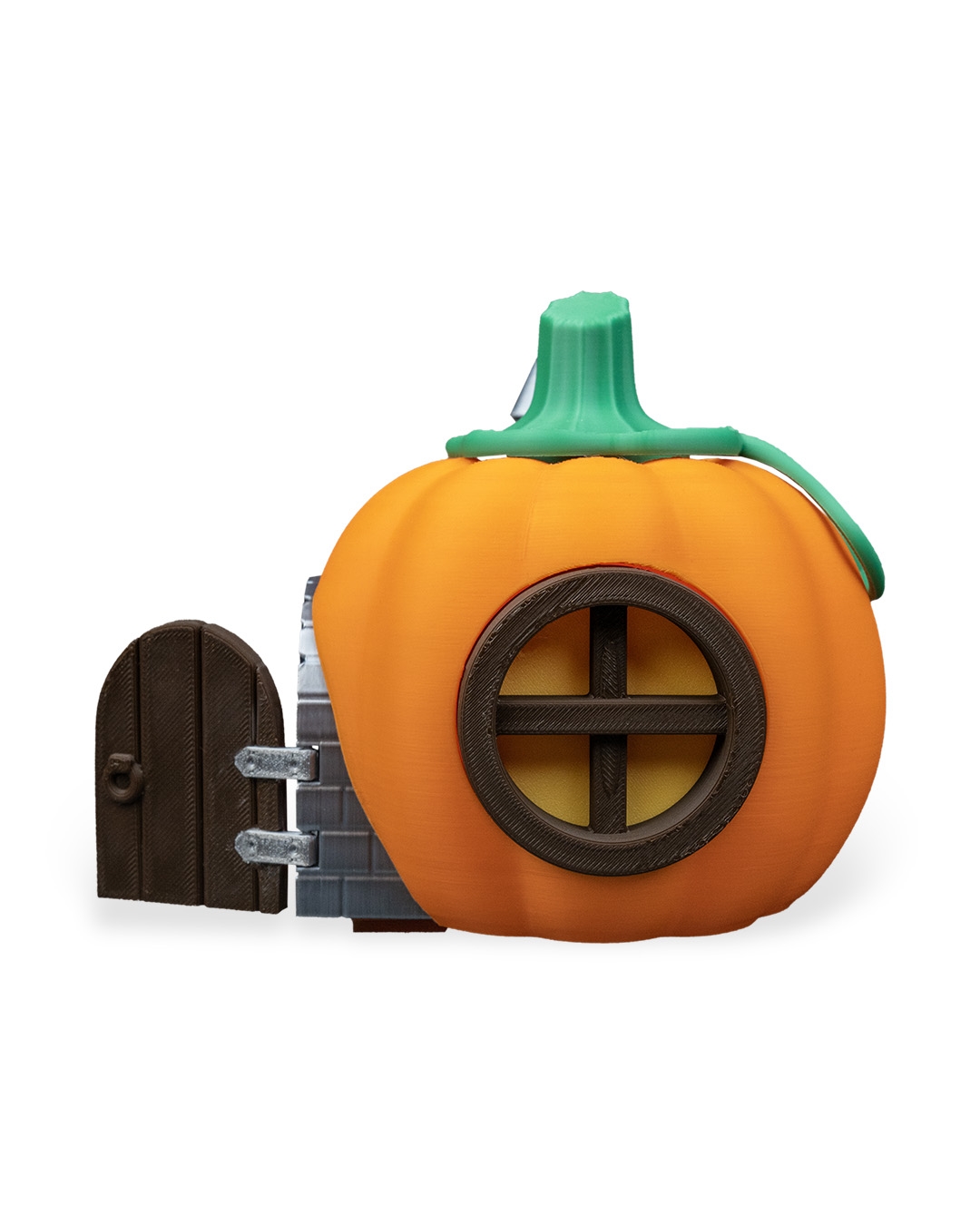 Ez a különleges 3D nyomtatott tökház egyedi és vidám kiegészítője lehet bármely otthonnak vagy őszi dekorációnak. A részletgazdag kidolgozás – kémény, levelek, boltíves bejárat – igazi mesebeli hangulatot áraszt.