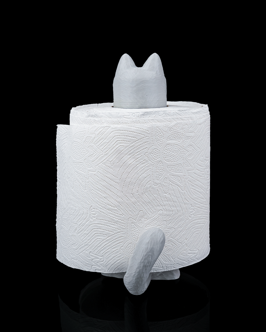 A morcos tekintetű, hosszúkás cica nem bújik el – ő maga tartja a WC papírt. A guriga a macska testén fut át, így a figura teljes egészében látható: karakteres fej, sárga, félig lehunyt szemek, tappancsok és a hátsó farokrész is része a látványnak.
